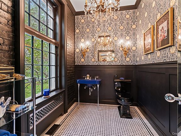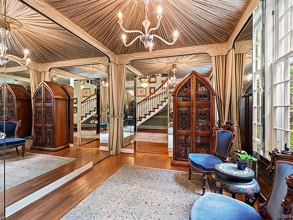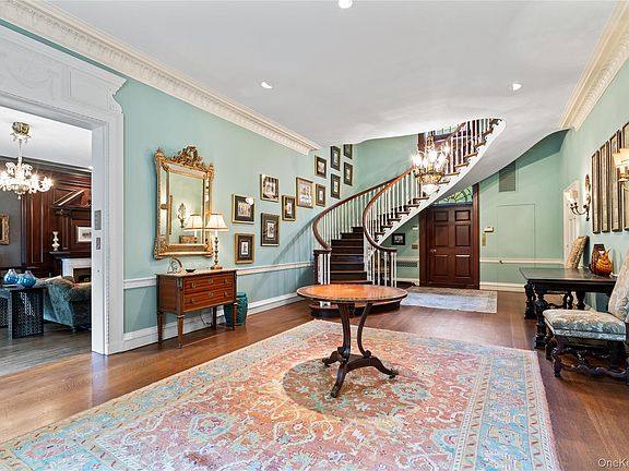OLD WESTBURY. ICONIC COLONIAL-REVIVAL MANOR - Set on 2.26 private acres, this 1932 William Lawrence Bottomley–designed Colonial-Revival estate is distinguished by its remarkable architectural form. A four-story brick center residence is flanked by two sweeping first-floor wings that extend in a graceful semi-circle, creating both symmetry and a sense of grandeur rarely seen. Inside, timeless details include a dramatic spiral floating staircase, arched windows, intricate moldings, multiple fireplaces, and light-filled entertaining spaces. The home features 6 bedrooms, 5 full and 3 half baths, including a regal primary suite with study, dual baths, and walk-in closets. Elegant gathering rooms include a banquet-sized dining room, a solarium with wet bar and billiards area, and a stunning octagonal library with imported, fluted, conical ceiling and incredible acoustics. The grounds are equally impressive, offering a heated gunite pool with brick surround, outdoor kitchen, and a pool house with party room, kitchenette, and baths, a circular courtyard with 5 garage bays, and slate and copper roofing complete this one-of-a-kind estate. A must see!!
