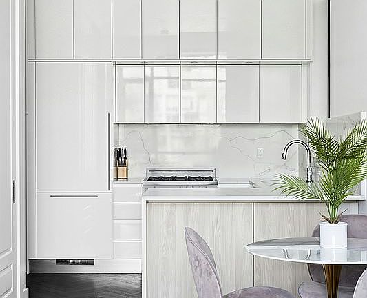 The modern luxury kitchen is a chef's dream, featuring floor-to-ceiling cabinetry and a sleek breakfast bar with a waterfall countertop and additional seating. Top-of-the-line appliances include a Bertazzoni range, a cabinet-front refrigerator and dishwasher, and a Delta Touch faucet. Incredible closet space throughout the residence ensures ample storage, while the stacked Bosch washer and dryer add to the convenience.