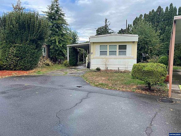 This is a great quiet neighborhood 55+ community with park rent of $675, includes garbage. Carport for 1 vehicle, two sheds on the property. All furniture stays, couch, table, beds, bookshelves. has a front kitchen dining area, center living room, and down the hall to the two bedrooms, bathroom in between the two. Washer and Dryer in the hallway stay with the home. backdoor to small yard space. As-is seller to do no repairs