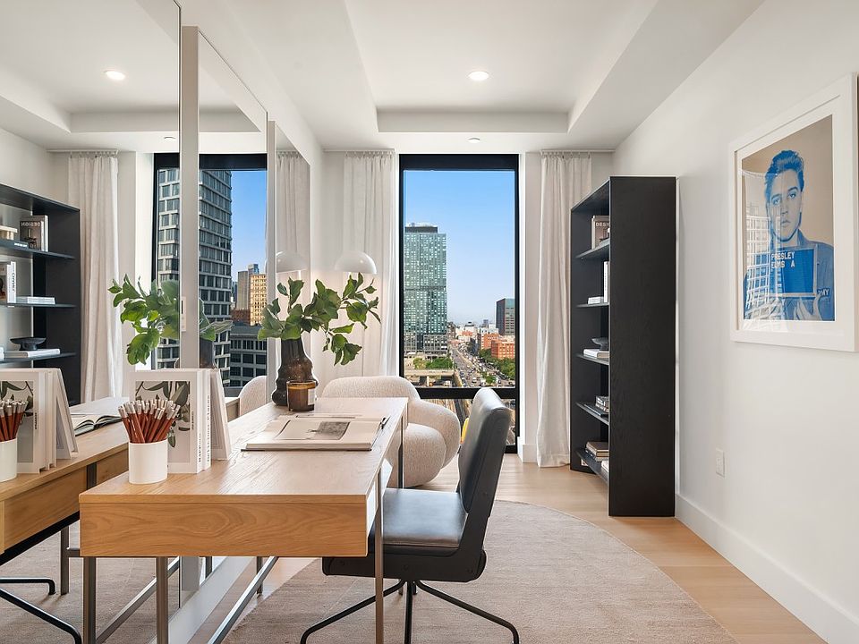 Floor-to-ceiling windowsDedicated home office spaceElegant modern finishesTree-lined streets