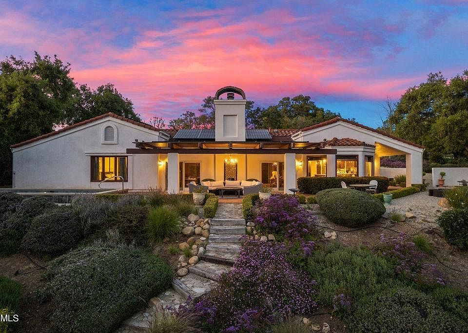An incredible view property with a classic Mediterranean single-story home, nestled within the scenic beauty of Saddle Mountain, offers a tranquil oasis that combines elegance with modern comfort. Recently enhanced with the addition of a beautiful pool & spa and an eco-friendly solar system to further enhance the simple lifestyle of Ojai living. The home radiates warmth and character from the eat-in kitchen with center island to the focal point fireplace of the great room. The primary bedroom offers a peaceful retreat with a spa-like bathroom and expansive views. Two other bedrooms flank the media room offering a seamless definition between public and private wings of the home. Some of the finishes like RTK tiles, hammered copper sinks, and European hardware help enhance the charm of the home while staying in theme with the architectural style. The property spans over 2 bucolic acres, providing a serene backdrop to the expansive patios and covered pergola. The landscaping highlights drought tolerant plantings and low maintenance shrubs with meandering paths that take one to the creek and trails. Additionally there is a detached two-car garage ideal as a workshop or could possibly be convert to an ADU.With so much to offer this special property delivers the pinnacle of the refined Ojai Valley lifestyle.