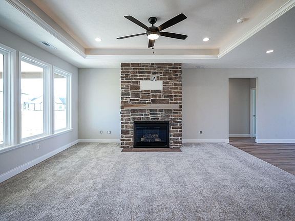 Introducing The Napier by Milakis Homes, a beautifully designed new construction ranch in the desirable Chesapeake Pointe neighborhood on Lafayette’s south side, ideally located just minutes from US-231, US-52, Purdue University, shopping, and TSC schools. This thoughtfully crafted split floor plan offers 2,189 square feet of open living space, featuring 3 bedrooms, 2 full baths, and a versatile den. A welcoming foyer entry sets the tone, leading into the impressive great room highlighted by a tray ceiling with crown molding and lighting, a custom fireplace with detailed surround and mantel, and three large windows that overlook the 16x14 covered porch. The gourmet kitchen seamlessly connects to the expansive dining area and boasts custom soft-close cabinetry, stainless steel appliances, a tiled backsplash, under-cabinet lighting, a walk-in pantry, and a 9-foot island with bar seating, perfect for entertaining. French doors open to the private office with closet, while the luxurious primary suite offers its own tray ceiling with crown molding and lighting, a spa-inspired ensuite bath with dual sinks and a custom tiled walk-in shower, and a spacious walk-in closet that connects directly to the laundry room with cabinetry, folding area, and mudroom with built-in cubbies and closet. Two additional bedrooms share a full bath, providing comfort and flexibility for family or guests. Completing this home is an oversized three-car garage with pull-down attic storage, a full yard irrigation system, and included water softener—combining elegance, function, and convenience in one exceptional package.