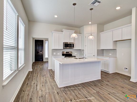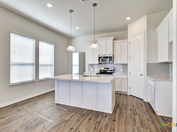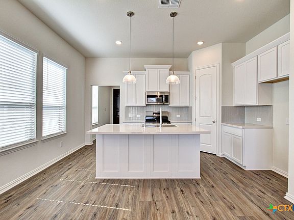 **Omega-stone Kitchen countertops, Stainless Steel Appliances, 8' Interior Doors** Come see this beautiful single-story Colorado floorplan by Brightland Homes, with 3 beds and 2 full baths. Located in a fun golf cart-friendly community, less than 2 miles from downtown Gruene! Blinds are hung at standard locations along with 8' interior doors. The spacious owner's suite bathroom has a recessed tiled walk-in shower with seat, double Marlena vanity with a 42" tall mirror, private toilet room with a window, and spacious walk-in closet. The open kitchen boasts 42" cabinets with crown moulding, Omega-stone countertop, ceramic tile backsplash, a center island with an Elite Water drinking system, Stainless steel appliances with an electric range, an externally vented fan, and a corner walk-in pantry. Bedroom 2 has a walk-in closet. The laundry room is off the garage entrance and has built-in shelving. The home's exterior has a covered patio, a 6' privacy fence with a gate, front gutters, and a professionally landscaped yard. **Photos shown may not represent the listed house.**