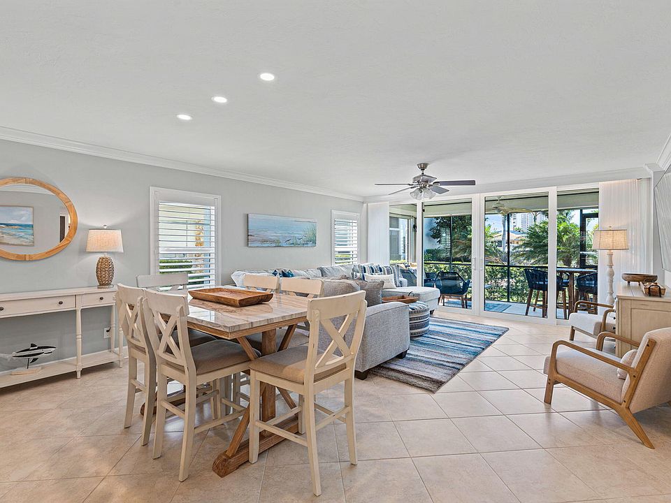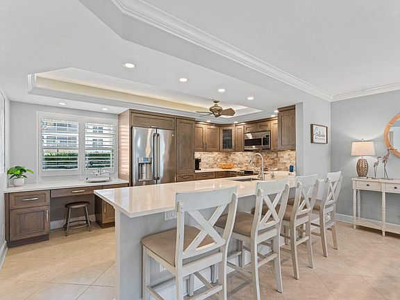 LOCATION, LOCATION, LOCATION!!! This stunning condo captures the essence of island living. Offering a BRIGHT, OPEN and AIRY layout, this 2-bedroom, 2-bathroom END UNIT provides the perfect coastal retreat. Enjoy peaceful water and pool views from your PRIVATE PATIO, while taking full advantage of all that Breezy Point Condominiums has to offer. For BOATING ENTHUSIASTS, this condo features a PRIVATE 35' DEEDED BOAT DOCK with a 14,000lb lift, and offers QUICK, DIRECT boating access to the Gulf . Just a SHORT DISTANCE to Marco Island's pristine white-sand BEACHES and restaurant, bar and grill, with fine dining and shopping just a short drive away, making this island LOCATION EXCEPTIONAL. The GOURMET KITCHEN has been beautifully updated with QUARTZ countertops, spacious breakfast bar, Cafe series refrigerator with built-in K-cup coffee maker, CUSTOM CABINETRY, a sleek glass tile backsplash, UNDER CABINET LIGHTING, and soft-close drawers. The OPEN LIVING area is perfect for hosting, with pocketing double-IMPACT SLIDING doors that lead to private patio, providing effortless access to the POOL, DOCKS and WATERFRONT. The MASTER SUITE offers breathtaking views, private slider to the patio, and a SPA LIKE BATH featuring quartz counter top DUAL VANITY, walk-in tiled shower with rain showerhead and spacious WALK IN CLOSET. The guest bedroom is generously sized with CUSTOM SHELVING, and guest bath featuring QUARTZ countertops and CUSTOM TILE. Breezy Point residents enjoy recent upgrades such as a newly ILLUMINATED seawall, four PARTY DOCKS, a fully renovated clubhouse and pool. Brick paver walkways leading to the shared amenities, including a grill area for residents, picturesque BAY and INTERSECTING CANAL VIEWS, complemented by TROPICAL landscaping throughout. The sparkling pool and deck provides a perfect space for RELAXATION and ENJOYMENT. Additional updates include a new metal roof, exterior paint, re-screened and framed patios. Perfectly located just TWO BLOCKS FROM BEACH entrance and only 10 minutes to open water by boat. Close to restaurants, shopping, and all the island has to offer. THIS IS A MUST SEE!!!