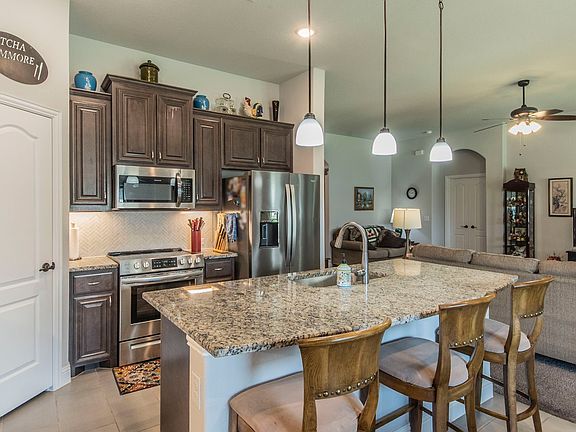 Recently-built Bloomfield Home is ready for its next owner! 4-2-2 has large formal dining, living, split bedrooms, and an extended covered back patio for your morning or evening relaxation. Enter the home to a welcoming circular entry hall with garage to the left and office or 4th bedroom to the right. A separate hall leads to two secondary bedrooms and a hall bath with double sinks. Ahead is the very spacious dining room, currently used as a game room, which will accommodate all your entertaining needs - a large dining table, hutch, buffet, and more. The living area features a wall of windows looking out to the landscaped yard and is open to the kitchen, which is a true chef's delight: granite counters, farm sink, island with breakfast bar, loads of extra storage & counter space, pendant lighting, and stainless appliances. Just off the living area is the primary bedroom with its own sitting area, complete with ensuite bath, separate vanities, large walk-in shower and walk-in closet. This home's floor plan accommodates so many flexible needs, and if you love being outside, there is plenty of space there as well. HOA offers 2 pools, a splash pool, community center, walking trails, stocked fishing ponds, a bocce ball court, putting green, and a dog park. Priced below similar new construction - make this home yours! Sellers would appreciate a lease-back period.