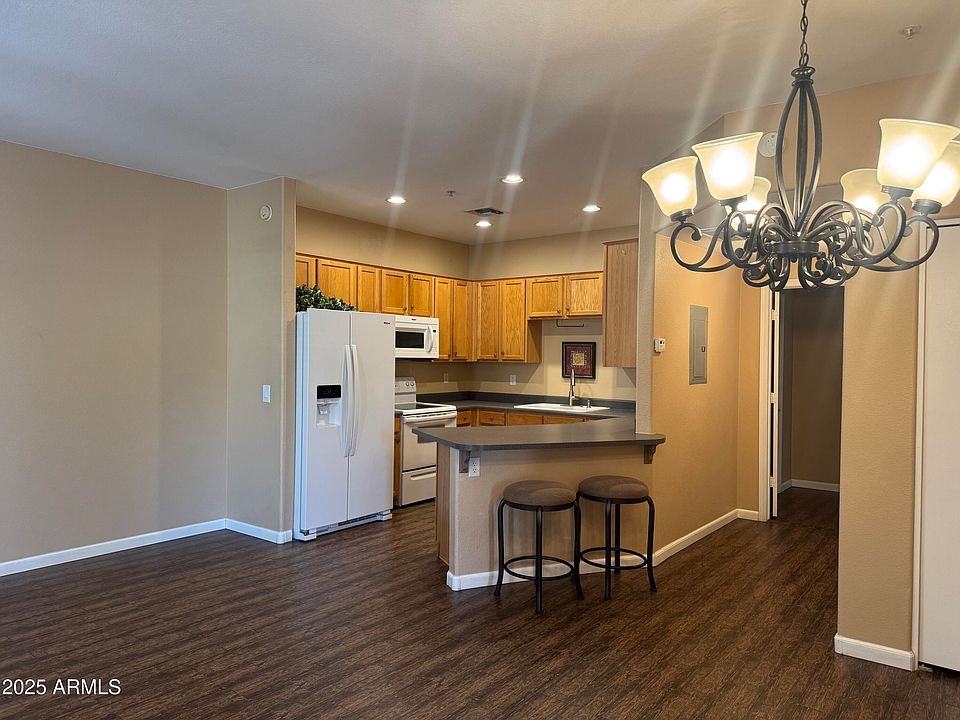 Featuring THREE bedrooms & 2 bathrooms, this bright & airy residence offers an open floor plan, vaulted ceilings & plenty of natural light throughout. The spacious kitchen is perfect for entertaining, offering ample cabinet space, & breakfast bar. Enjoy relaxing evenings in the cozy living room or outside on your private covered patio. The primary suite includes a generous walk-in closet and a well-appointed en-suite bathroom with dual sinks. Additional highlights include brand new tile flooring throughout, fresh paint, in-unit laundry & a covered parking space. Located near the community pool and hot tub. NOT AGE RESTRICTED. Close to Luke AFB, shopping, State Farm Stadium, casino, restaurants and located in A rated Peoria School District!