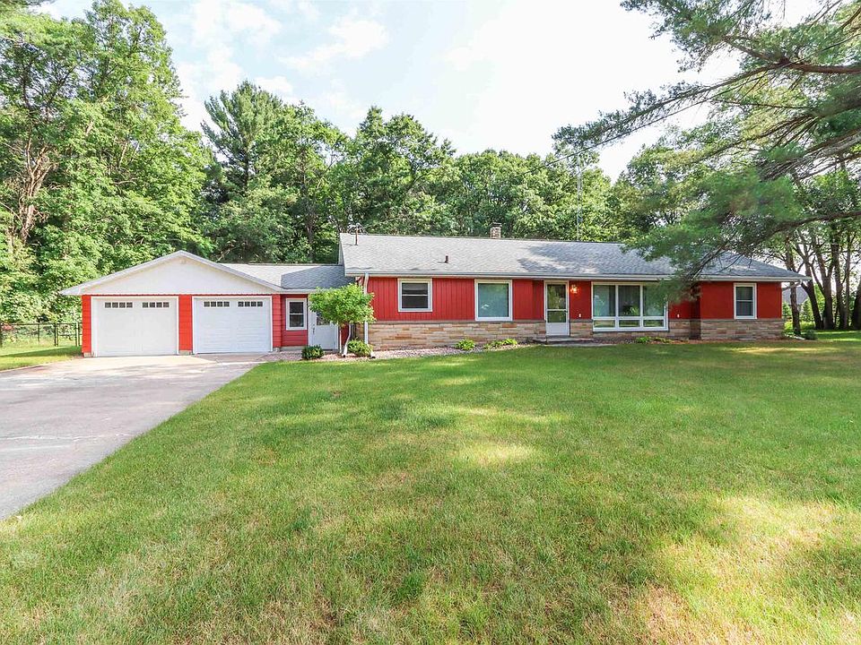 Open House Sunday, July 9th, from 10:30am-12:30pm Available for your consideration is this tastefully updated rambling ranch situated on almost 2 acres of peaceful bliss in the Town of Grant. This affordable home offers its new owners a long list of creature comforts that you will appreciate every single day!,First thing you will notice as you park in the driveway is the scenic, park-like setting with towering mature trees offering privacy, beauty and home to abundant wildlife. Professional landscaping has already been completed on the south and east side of the home with flowering trees, perennials, and custom paver entrance. Walking to the west side of the property, there is a second driveway that leads back to a pavilion with metal roof and a 3 stall detached garage. The garage is in need of repair but has been used just for cold storage in previous years. The attached, oversized 2 stall garage has a new service door installed for access to the fully fenced (powder coated black chain link) private backyard. From the garage you enter first into the spacious breezeway. This large area is a perfect drop space for boots and jackets. Two steps take you into the kitchen that has abundant counter and cupboard space. The kitchen is open to the dining area which flows into the living room. Both rooms have large windows that capture the scenic beauty of the front yard while also letting in so much natural light. The main level also includes 3 bedrooms, 2 full baths and main floor laundry. There is a ton of closet space and access from the laundry room to the backyard. The lower level, accessed from the breezeway, is clean and ready for added living space if the new owner so chooses. Shelving units offer additional storage as well. There are multiple pages of major updates that have been done in the past 5yrs available upon request. This truly is a rare opportunity to own a piece of heaven on earth...schedule your private showing today.