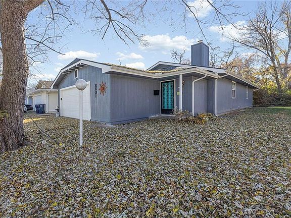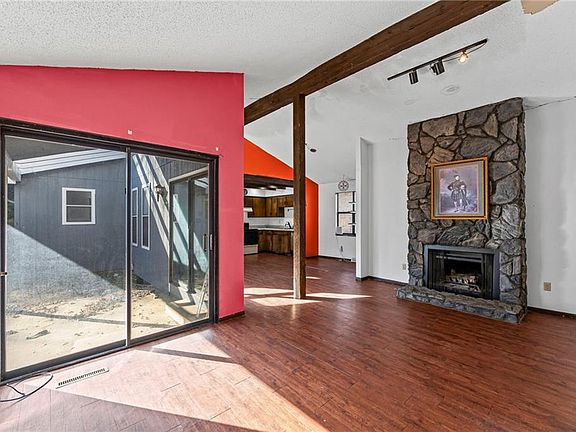 Cozy and full of character, this 2 bedroom, 2 bath ranch at 8801 E 109th is ready for its next chapter. Step inside to a vaulted great room with exposed wood beams, stone fireplace, and wood-look floors that give the space a warm, inviting feel. Large windows and a sliding glass door let in tons of natural light and walk out to the backyard.