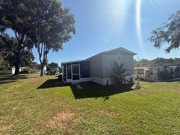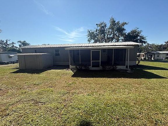 Moonrise Resort is a peaceful outdoor retreat community. It is a blossoming resort full of shady majestic oaks and colorful flora, making it an ideal location for nature lovers and relaxation seekers alike. Located on a corner lot, this property also offers access to boat slips and boat storage, making it perfect for boating enthusiasts. This well-maintained mobile home offers 2 bedrooms, 1.5 baths, and a fantastic open floor plan designed for comfort and convenience. Enjoy peace of mind with central air conditioning, roof-over, and durable metal siding. Step inside to a bright and spacious living room featuring vinyl plank flooring, neutral walls, cathedral ceilings, and abundant natural light. The living room flows seamlessly into the kitchen and offers convenient front-door entry. The kitchen is a standout with stainless steel appliances, neutral countertops, medium-tone cabinetry, and a large eat-in dining area. Additional highlights include an overhang bar with storage, a double stainless steel sink, and a charming plant shelf perfect for décor. The dining room is open to both the living room and kitchen, showcasing matching vinyl plank flooring and neutral tones for a cohesive look. The master bedroom features neutral walls, vinyl plank flooring, and an attached half bath. The second bedroom offers great space, also with vinyl plank flooring and neutral décor. The guest bathroom includes a tub/shower combo, a generous vanity, and neutral finishes. A washer/dryer hookup is conveniently located in the hallway. Outside, relax in the inviting lanai, an ideal outdoor space for enjoying the Florida lifestyle. A large storage shed provides additional functionality. Don't miss this wonderful opportunity to own a bright, open, and move-in-ready home with excellent amenities! All listing information is deemed reliable but not guaranteed and should be independently verified through personal inspection by appropriate professionals. All Florida Mobile Home Sales Inc. cannot guarantee or warrant the accuracy of this information or condition of this property. The buyer assumes full responsibility for obtaining all current rates of lot rent, fees, and pass-on costs. Additionally, the buyer is responsible for obtaining all rules, regulations, pet policies, etc., associated with the community, park, or home from the community/park manager. All Florida Mobile Home Sales Inc is not responsible for quoting of said fees or policies. LOT RENT: $736 and includes lawn, trash and pass-on taxes.