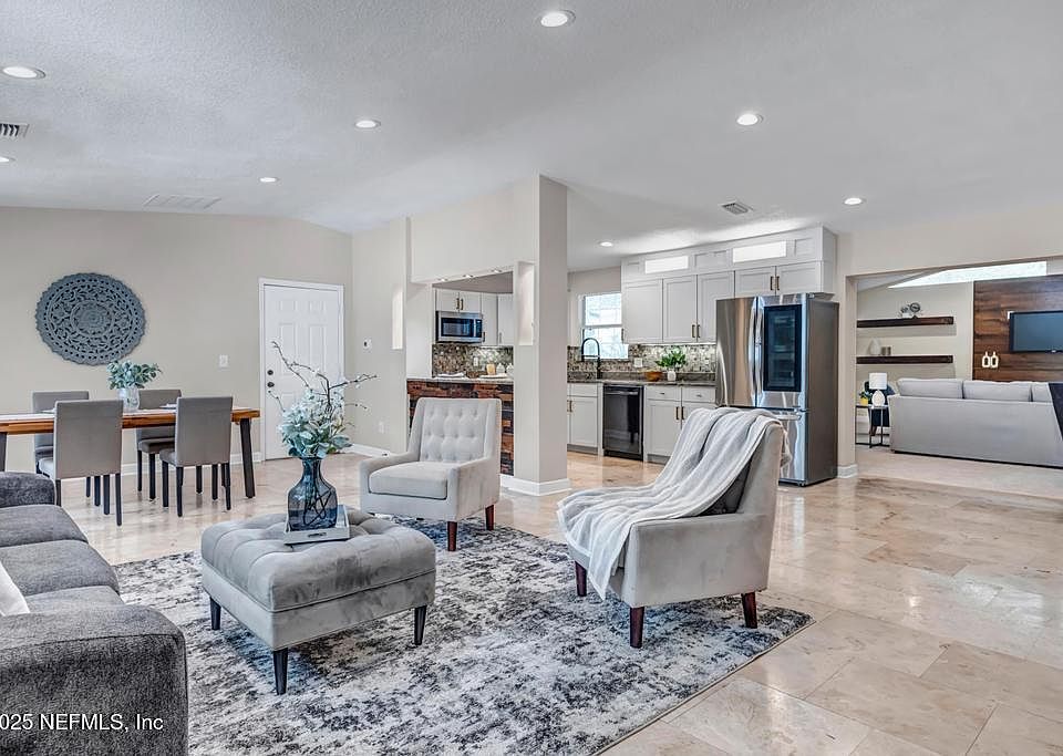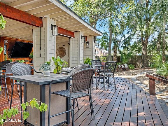 Your Private Backyard Oasis Awaits! Why go on vacation when you can live in one? This beautifully renovated 2,500 sf home features a backyard retreat designed for relaxation and entertaining. It is completely private and boasts a spacious covered deck large enough for full outdoor furnishings and a large screen TV. Just steps away, a firepit creates the perfect gathering spot for cozy evenings with family and friends, roasting marshmallows, or unwinding under the stars. With ample space and true seclusion, this backyard feels like your own private resort. The home itself is just as impressive, offering a brand-new roof as well as updated electrical, plumbing, & sewer. The kitchen offers newer stainless steel appliances and granite countertops. Travertine flooring and new carpet throughout. Bathrooms shine with new vanities, and bedrooms feature ceiling fans for year-round comfort. A 2-car garage provides plenty of storage. Additional storage unit on side of deck. Buyer to verify s.f