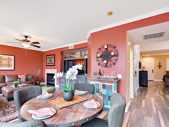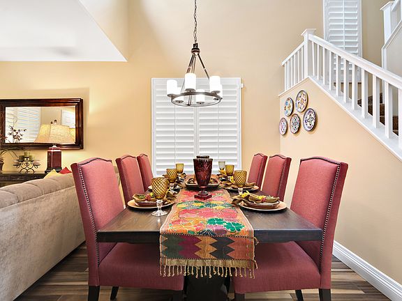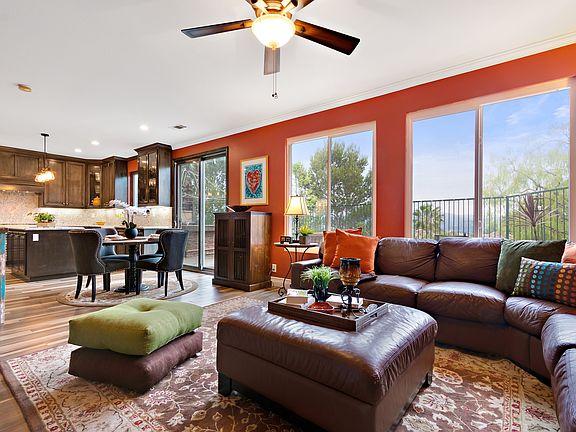 A Sight to Behold - Located in the Cambria community of Anaheim Hills, this home shares stunning mountain views and city lights. A very attractive, well-designed home with distinctive features and a warm welcoming environment. Formal living room and dining room complete with custom plantation shutters. A custom gourmet kitchen with dining area and family room. Modern kitchen with impeccable design elements: granite countertops and backsplash, high quality cabinet craftsmanship with glass showcase cabinets and under cabinet lighting, gourmet stainless steel appliances, feature lighting, apron farm-style sink and dual-access kitchen center island. Beautiful family room fireplace and a spectacular custom built-in designer media center. Kitchen and family room open out to a beautiful backyard with a diamond cut pattern concrete patio. Outdoor entertainer's dream with outdoor kitchen showcasing the majestic views. The kitchen features a BBQ unit,Teppan style griddle, stainless steel sink with water heater and garbage disposal, natural gas and electrical outlets--ready for entertaining!! Expansive Master retreat with dual vanity, shower and soaking tub; walk-in closet custom shelf system. This gorgeous space has vaulted ceilings and amazing views. Three spacious bedrooms located on the second level all with mirrored closet door. Large and beautiful second bathroom with dual vanity. Convenient desirable second floor laundry room. Designer flooring throughout including porcelain wood-plank tile, engineered wood and high grade carpet. Freeway close, this development is convenient for work or nearby shopping and dining. In the award-winning Anaheim Hills school district, it is the perfect place for creating memories.
