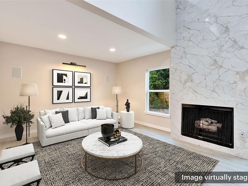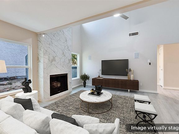Tiled fireplaceTrendy finishes and fixturesBackyard patioLovely natural lightHigh ceilingsSplit levelStainless steel appliances