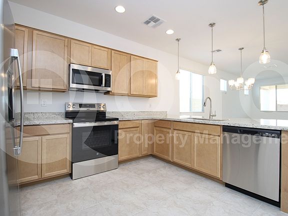 Welcome to this stunning 3-bedroom, 2-bath home offers a thoughtfully designed single-story layout with modern features and an open-concept living area perfect for everyday comfort and entertaining. The kitchen boasts sleek stainless steel appliances, a spacious pantry, and a breakfast bar overlooking the dining and living rooms. Enjoy carpet and tile flooring throughout, ceiling fans, and a split floor plan for added privacy. The primary suite includes a walk-in closet and an ensuite bath. Outside, relax on the covered patio in your fully fenced backyard. Additional highlights include a 2-car garage with opener, HOA-maintained front landscaping, and in-home washer/dryer included. Located near Westgate, State Farm Stadium, shopping, dining, and quick freeway accessthis home offers comfort and convenience in one of Glendale's most desirable neighborhoods. Prime location just 1 mile from neighborhood markets, pharmacies, and major fast-food restaurants. Conveniently close to Cardinals Stadium and Tanger Outlets