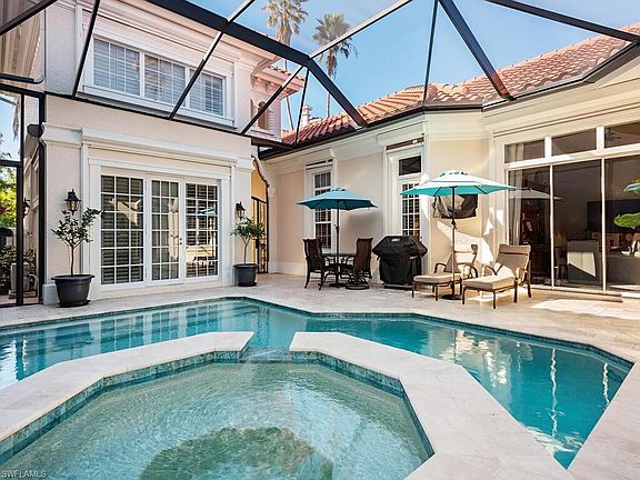 A find. A perfectly-proportioned, intelligently-priced, single-story main house with quality finishes, significant updates and sophisticated design, 3,377 sq. ft. under air, offering the perfect combination of private and public space, indoors and out. This villa is situated on The Villas La Palma’s western cul-de-sac, a very private location in the community and a property not damaged by flooding; FEMA maps show this property in the X500 flood zone. The home’s southwestern exposure means many hours of sun on the freeform pool, the expansive paved deck with multiple entertainment areas and the spa. Of note in the main house: a grand master suite with large walk-in shower and beautifully fitted master closet (85 sq. ft.), a large salon with 15’ volume ceilings, and, adjoining the well-appointed kitchen, a large dining/family room area. Also,one spacious guest bedroom, ensuite, with fitted walk-in closet; a study with views of the entry courtyard and pool; a smaller guest suite suitable for a bedroom but now used as a fitness space; and, a third, full bath. The roof was replaced in 2014. In the separate two-story cabana/guest house with private access from the entry courtyard, a spacious first-floor living room with kitchenette and full bath and, on the second floor, a large bedroom loft (350 sq.ft.) with additional space for a sitting room or office. Two-bay garage with extra storage. Lush landscaping, beautifully lit for maximum atmosphere at night, and a view to the east of La Palma’s peaceful water feature and rock garden. Residents in Bay Colony, which is located within the sought after-beachfront community of Pelican Bay, enjoy private beach access with hospitality services on the sand via the recently remodeled members-only Bay Colony Beach Club; dining at the BC restaurant and use of the Bay Colony tennis center. In addition, Bay Colony residents have access to all of the amenities that Pelican Bay has to offer - two additional private beach restaurants and over two miles of Gulf-front coastline. Also nearby: the elegant Waterside Shops and Artis-Naples, a world-class performing arts center and The Ritz Carlton-Naples.