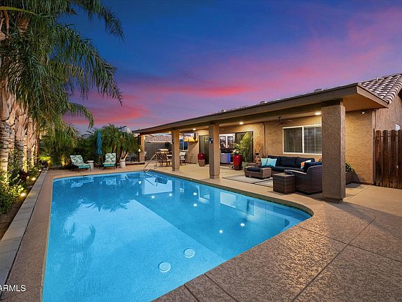Discover your own desert oasis! This meticulously upgraded 3-bedroom, 2-bathroom home spans 1304 square feet and offers an unparalleled living experience. Step into a backyard paradise featuring a recently resurfaced pool with new tile, a full-length canopy for ultimate shade, and landscape lighting with a dusk-to-dawn timer, all complemented by a newly installed natural gas pool heater and variable speed pump for year-round enjoyment. The front and back yards boast fresh landscaping and a new PVC sprinkler system. Inside, the living room is bathed in natural light thanks to a stunning 16-foot sliding glass door. The kitchen is a chef's dream, showcasing gleaming quartz countertops, new lighting over the bar, and both over and... under-cabinet lighting. Both bathrooms have been exquisitely remodeled: the primary bath features a luxurious walk-in tile shower, and the guest bath boasts a new tub and tile surround. Additional interior upgrades include elegant wood flooring, plush Keristan carpet with an upgraded pad, and a fresh coat of interior paint.
