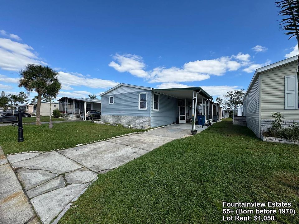55+ PARK/ $1050 LOT RENT/ 3BED2BATH+DEN /SCREENED-IN PATIO *** SPECIAL OFFER IN FOUNTAINVIEW ESTATES WHEN YOU BUY WITH US!*** Fountainview estates requires insurance on their homes, Which also requires a 4-point inspection to be completed, we are offering: -Free 4-point inspection -Free Insurance Consultation & Guidance with purchasing your policy. ~~~ Welcome to this beautifully maintained 1992, 3-bedroom, 2-bathroom + DEN, 1,344 sq. ft. home in the sought-after Fountainview Estates, a vibrant 55+ gated community! As you step inside, you'll be greeted by an open floor plan with vaulted ceilings and large windows, creating a bright and airy feel. The kitchen features stainless steel appliances, a wine fridge, a tile backsplash, and bar-style seating-perfect for casual dining and entertaining. The spacious living room provides plenty of space to relax or host guests. The primary suite is oversized and includes a huge walk-in closet and an en-suite bathroom with ample vanity storage, newly installed light fixtures, and a tiled walk-in shower. Adjacent to the primary suite is a Den/Bonus room, ideal for work, hobbies, or extra storage. The two additional bedrooms are generously sized and conveniently located near the second bathroom, which also features a walk-in shower. Outside, this home offers a large driveway, carport, and storage shed, along with a screened-in patio, providing a perfect shaded retreat to enjoy the Florida weather. Located in Fountainview Estates, this active 55+ community offers an unbeatable resort-style lifestyle with incredible amenities, including two pools (One heated all year), a jacuzzi, a pavilion with a grill area, shuffleboard, pickleball, bocce ball, a billiards and poker room, a fitness center, a library, and laundry facilities. With planned social activities and community events, it's easy to stay active and meet new friends. Don't miss this incredible opportunity-schedule your showing today!