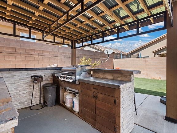 This home offers a great layout with OWNED SOLAR PANELS that help offset energy costs and when summer arrives, enjoy running the A/C full blast! The backyard includes an Outdoor Kitchen, Large Patio, and space to gather or relax. Inside, the Kitchen features Granite Counters, a large Island, Tile Backsplash, and Upgraded Cabinets, opening to the Great room. The main level includes an Office that can serve as a fifth bedroom, plus an office nook off the kitchen. Upstairs is a loft-style Media or family room, a Primary Suite with a large shower, double vanities, and two walk-in closets, plus three additional bedrooms- all with walk-in closets- and a full bath. Storage is generous throughout. Ready now!