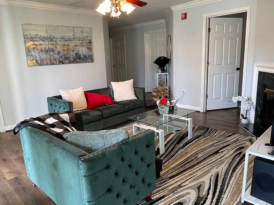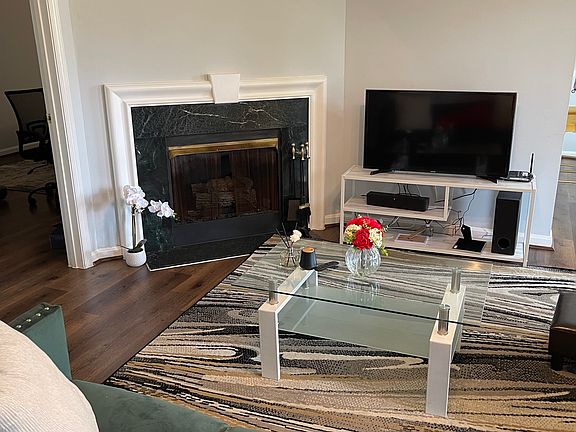 The spacious living room features a cozy gas fireplace, perfect for relaxing evenings. Large windows flood the space with natural light, and the private balcony provides a peaceful outdoor retreat with scenic views. The separate dining area is ideal for entertaining, enhanced by elegant lighting.