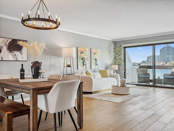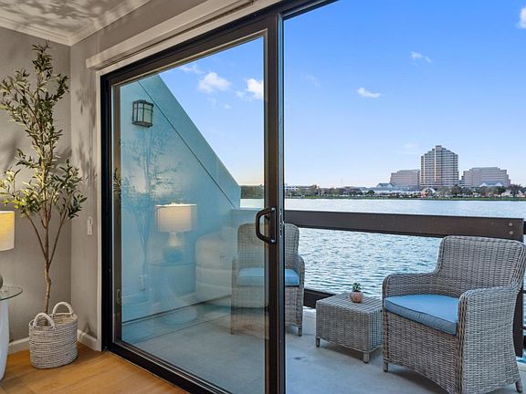 Top-floor condo with breathtaking wrap-around views of Central Lake offering serene waterfront living. The open living and dining area is an open space flooded with natural light, featuring a tiled fireplace with built-ins, and sliding glass doors leading to a balcony. The balcony is perfect for morning coffee, afternoons watching boats glide by, and a front-row seat to yearly fireworks. The modern kitchen boasts sleek quartz countertops, a stylish glass subway tile backsplash, ample soft-close shaker cabinetry, stainless steel appliances, and a versatile coffee bar. An adjacent sunlit family room with solarium windows provides additional flexible space. Upstairs, the primary suite showcases soaring ceilings, a gas fireplace, and the same picturesque views of Central Lake. An ensuite bath with a soaking tub under a skylight, dual showerheads, and ample closet space make for a spacious retreat. A secondary bedroom features its own updated ensuite. Located in the award-winning The Islands community with a pool, hot tub, clubhouse, and boat dock, this home offers a low-maintenance, resort-style lifestyle with direct access to scenic parks, shopping, dining, and a vibrant waterfront community, while providing convenient access to SFO and major freeways for easy commuting.