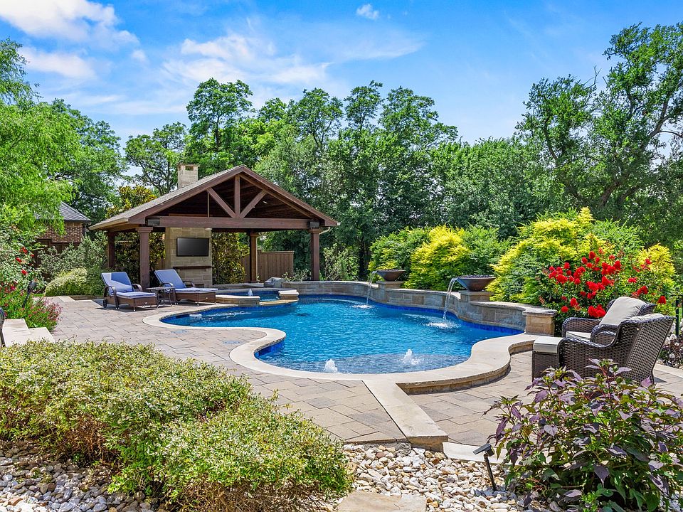 Nestled in a boutique gated community in Prosper and served by highly acclaimed PISD schools, this recently updated home sits on an expansive .38 acre east-facing corner lot backing to a tranquil greenbelt. Designed with both comfort and entertaining in mind, the resort-style backyard features a sparkling pool with water and fire bowl accents, relaxing spa, a pergola-shaded outdoor kitchen with built-in grill and Green Egg smoker, and a cozy outdoor fireplace. Inside, the 4,289 sq ft floor plan offers 4 bedrooms, 3.5 baths, a formal dining room with a coffered ceiling and picturesque views of the community ponds and fountains, an enclosed game room for added privacy, and a dedicated media room. The showstopping kitchen has just been renovated with luxurious Taj Mahal quartzite countertops, a designer picket backsplash, and top-of-the-line appliances, including Frigidaire Professional and a Dacor gas cooktop, plus a walk-in pantry and butler’s pantry. The living room impresses with a stone-accented fireplace wall, built-ins, and views of the lush backyard retreat. A private study with a nearby half bath presents an easy conversion opportunity for a second downstairs suite. Additional upgrades include a new roof, freshly re-stained shutters, garage doors and fencing, and a 3-car epoxy garage with storage system and Level 2 EV charger. No MUD or PID!