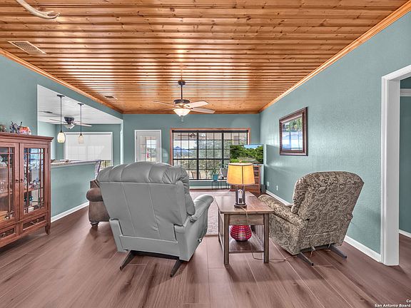 Experience peaceful lake living in the heart of the Texas Hill Country - just 20 minutes from San Antonio's newest thoroughfare at 211 and FM 471. This thoughtfully crafted home offers easy lake living with all the comforts you need. Featuring 3 bedrooms, 2.5 baths, and spacious open living areas, the layout feels bright, functional, and welcoming. The kitchen offers generous counter space, ample cabinetry, and beautiful granite countertops, perfect for gathering and entertaining. When the lake is up, step right from your backyard into days of boating, jet skiing, and swimming. A private dock is available and negotiable with a strong offer, making water access effortless. Enjoy outdoor living year-round with an above-ground swimming pool, a covered patio with a convenient half bath, and plenty of space to relax or entertain. The home's charming details-like beadboard ceilings, wood-like tile flooring, and thoughtful craftsmanship-add warmth and character throughout. A two-car attached garage, two-car detached garage, and covered parking for an RV or boat offer plenty of storage and flexibility. The property includes a private well and septic system, ensuring comfort and independence. Whether you're seeking a full-time retreat or a weekend getaway, this home blends tranquil lake life with modern convenience in one of Medina Lake's most peaceful coves.