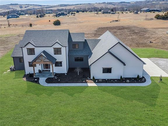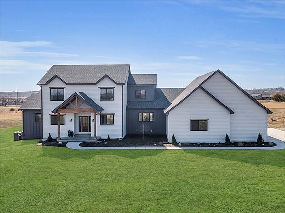 Upstairs, you'll find two bedrooms, a loft, and a full bath with dual vanities. The expansive basement offers 3 additional bedrooms, a family room, a media room, a full bath with dual vanities, and a powder room. The family room is already designed with a space plumbed and wired for easy installation of a bar. A fenced-in area off the main level covered deck is perfect for pets or outdoor entertaining. Conveniently located near Rock Chalk Park, this home offers a rare opportunity to own a custom property on acreage in a sought-after location.
