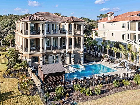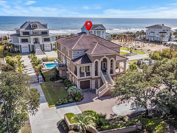 Welcome to an Elegant Oceanfront Sanctuary located in the Exclusive Dunes Club. This Luxurious 5-bedroom, 6-full and 2-half bath Home, boasts amazing ocean views and exquisite design details. No Short Term Rentals allowed!!! Beautiful Entry with grand Metal Doors flow into a spacious foyer with beautiful Porcelain Tile throughout, setting a sophisticated tone for the open floor plan. Has a three stop elevator for convenience. To the right, a formal Dining Area awaits, perfect for hosting intimate gatherings. This floor plan allows access to the dining area from the gourmet kitchen and butlers pantry apart from the main flow to the Living Area. As you enter through the foyer, a wet bar to the left invites you into the heart of this refined coastal home. The main living area is accented by stunning columns adorned with Mother of Pearl shell, adding a touch of elegance and natural beauty. A gas fireplace, with new gas logs in 2022, and custom built-ins creates a cozy gathering space, seamlessly opening into a gourmet kitchen and breakfast area. The kitchen features top of the line, professional stainless appliances, quartz countertops, plenty of work space and a step up counter for dining, breakfast nook, and a butler's pantry, all while enjoying the ocean views. The main living floor offers a serene master suite with breathtaking views and direct access to the covered porch, perfect for enjoying morning sunrises. The master bath is a spa-like retreat with a luxurious soaking tub, a beautiful tiled walk-in shower, and an expansive walk-in closet. This level also includes a versatile office/flex room, which could serve as a fifth bedroom complete with a full bath----ideal for Nursery, work space, or work out area. Ascending to the third floor, you'll find a spacious family room featuring a cozy gas fireplace, electronic blinds, and balcony access with breathtaking ocean views. This level hosts three guest bedrooms, each with its own en-suite bath, ensuring privacy and comfort for all. A dedicated theater room, complete with plush seating and step lighting for a true cinematic experience right at home. Just outside the theater, a small efficiency kitchen provides convenient access to snacks and refreshments, making this floor a true retreat for relaxation and entertainment. They will want to move in and not leave. The ground level is designed for ultimate entertainment, featuring a large flex space with a Trackman golf simulator, an indoor grilling station with stunning stonework and granite counters, and a full bath. A serving window for easy access to the pool and this area has a separate HVAC system. Step outside to a resort-style saltwater heated pool and spa, a covered Pergola and a fire pit area, all connected by a private fenced walkway to the beach. A marine-grade spiral staircase links the second-floor porch to the patio, enhancing the seamless outdoor flow. Additional highlights include dual laundry rooms—one on the main floor and another on the ground level with Electrolux appliances, upgraded porcelain tile in main living areas, two Rinnai continuous hot water systems, and a professionally landscaped yard with well-fed irrigation and the best lighting for outdoor scapes. A beauty at night. The rear porches have been upgraded with Trex decking, and the attic is spray foam insulated for added efficiency. Enjoy all bathrooms with luxurious Toto Washlet systems and ample storage in a spacious 2.5-car garage. Some photos have been virtually staged.