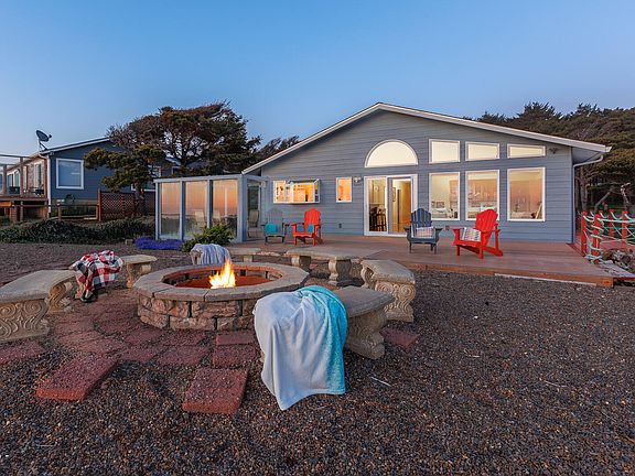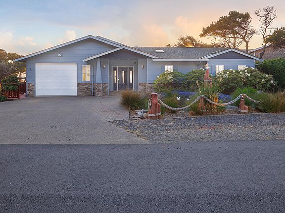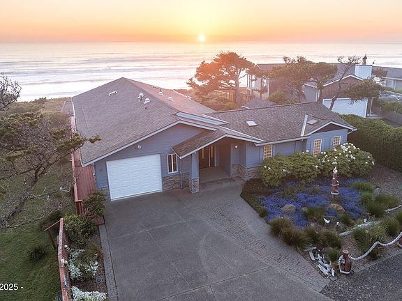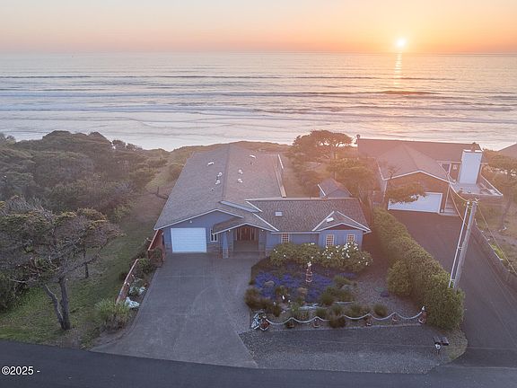 Stunning single-level oceanfront home just outside Newport in the welcoming Pacific Shores neighborhood. This 2-bedroom, 3.5-bath retreat offers two additional office spaces and 2,360 sq ft of thoughtfully designed living. Enjoy panoramic ocean and lighthouse views from the large back yard with an outdoor dining area with glass surround and panoramic ocean views. The kitchen features granite countertops and generous cabinet space. The spacious primary suite includes a fireplace and dual ensuite baths. A second ensuite adds comfort for guests. Recent updates include a new roof and fresh exterior paint. Relax in the hot tub, gather around the firepit, and enjoy access to the neighborhood's deeded beach trail—perfect for sunset strolls.
