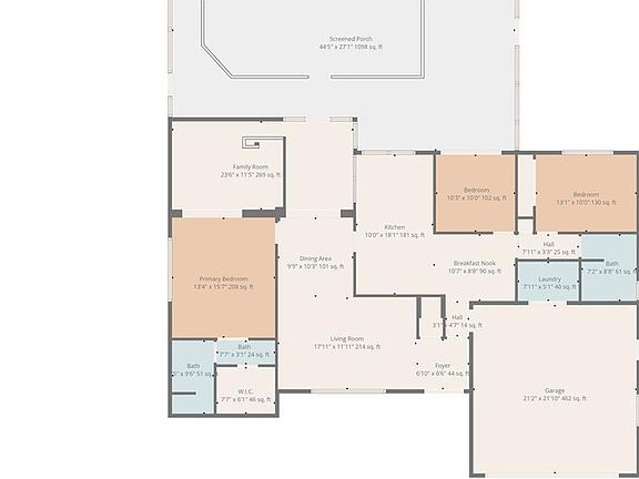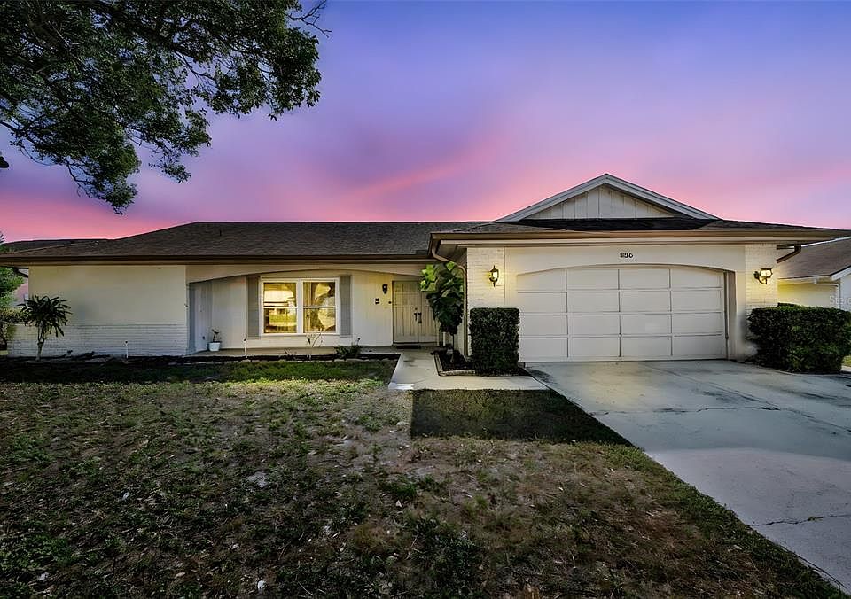 Single-story 3-bedroom, 2-bath, 2-car garage home in the Beacon Woods golf community, offering a flexible split-bedroom layout, multiple living areas, and an expansive screened outdoor living space. A wide covered front porch with double-door entry opens to the main living room, where you have room for seating, media, and conversation areas. Just beyond is the dining area and additional family room, creating a natural flow for everyday living or hosting guests. The centrally located kitchen features wood cabinetry, solid-surface counters, black appliance package, double stainless-steel sink, breakfast bar, and a pass-through window to the bonus room, making it easy to serve snacks or drinks. A separate breakfast nook with large windows overlooks the screened porch and deck. The primary suite is set on one side of the home and includes tile and wood-look flooring, space for a king-size bed, a walk-in closet, and a private bath with vanity, step-in shower, and an adjoining sitting area that can function as a reading corner, fitness space, or dressing area. On the opposite side of the home, two additional bedrooms share a full bath with tub/shower combo, tile surround, and storage vanity. Interior laundry room and an oversized 2-car garage with workbench area, storage options, side service door, and attic access add everyday convenience. Along the rear of the home, an approximately 44' x 27' screened porch and deck create a true outdoor extension of the living space with room for dining, grilling, lounge seating, plants, and hobbies. With no interior stairs and all main living areas on one level, this property offers practical single-story living. Beacon Woods is an established golf community with mature trees and sidewalks, offering access to a heated community pool, clubhouse, fitness center, tennis and pickleball courts, basketball, and shuffleboard, along with an 18-hole public golf course. The location is close to everyday essentials, medical facilities, and Gulf Coast recreation: approx. 1.4 mi to local shops and restaurants along Fivay Road, about 2.5 mi to HCA Florida Bayonet Point Hospital, about 3.4 mi to Hudson Beach Park on the Gulf of Mexico, roughly 9 mi to downtown New Port Richey and Sims Park, and about 10 minutes to the Suncoast Parkway for trips toward Tampa, the airport, and the Nature Coast.