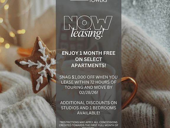 - Special offer! Now Leasing: Enjoy 1 month free on select apartments + apply within 72 hours of touring and snag $1,000 off your rent! Take advantage of additional discounts on studio and 1 bedroom apartments! *Restrictions may apply. All concessions credited towards first full month of tenancy. Must apply by 02/28/2026. Ask us about our longer lease terms NOW available! Schedule your personalized tour today or call for details!