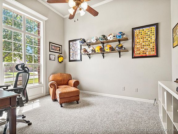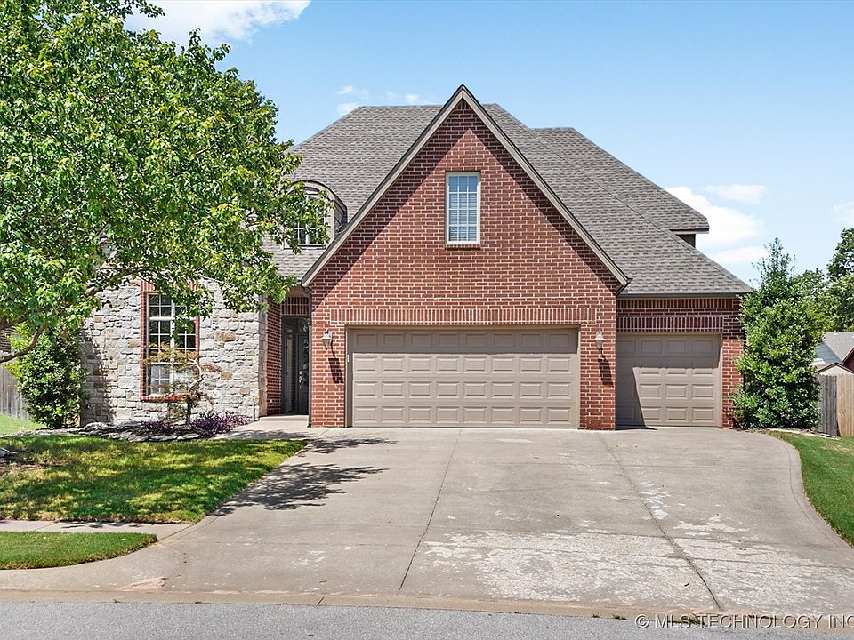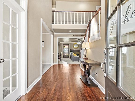 Well maintained spacious move-in ready home with brand new carpet throughout, this stunning home offers both elegance and comfort! A grand entrance with a vaulted ceiling welcomes you into a space adorned with beautiful hardwood floors. The main level features a dedicated office and a formal dining room, perfect for hosting gatherings. The kitchen is a true highlight, with abundant storage, stainless steel appliances, wine rack with built in buffet, and granite countertops. The island provides additional seating and open concept to the large living room, making it ideal for entertaining. The spacious master suite is a true retreat, featuring an en suite bathroom with a walk-in closet, a luxurious whirlpool tub, a separate shower, and double vanities. Upstairs, you'll find three additional bedrooms and two full baths, along with a game room and a large bonus room for versatile use. Recent updates include new carpet installed in August 2024, new extended covered back porch in 2022, new roof & water heater installed in 2020. This home combines modern amenities with timeless style. Close access to HWY 169, Creek Turnpike, restaurants and shopping in the Bixby School District.