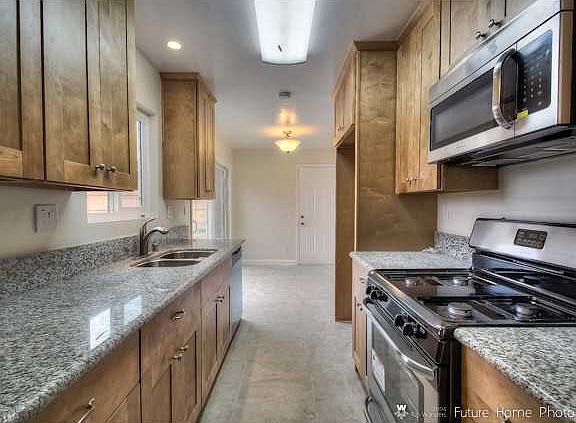 Upgraded single level home w/quality finishings throughout! Move right into this beauty! New cabinetry, granite counters & stainless steel appliances in kitchen. Tile flooring in kitchen. New carpet throughout. Beautiful bath w/dual sinks, granite counters, tiled shower, tile floors. New windows & sliders. Huge patio & yard! Great value for this great home!