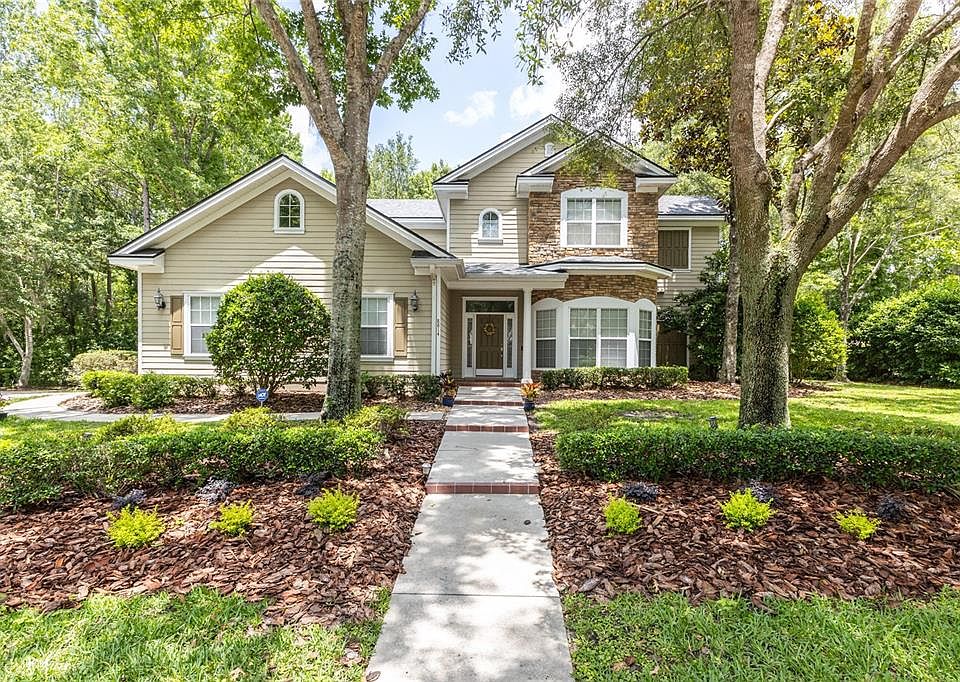 Come experience this unique blend of luxury and lifestyle re-defined. This beautiful residence features soaring 20' ceilings, wood floors, granite counters, abundant moldings and outstanding natural light. Prepare meals in comfort in your spacious open kitchen with wood cabinets, 2023 stainless appliances and an open interface with the stunning great room and its 20' high ceiling, built-in shelves and cozy gas fireplace with decorative stone surround. Relax at the end of a long day in the soothing, downstairs primary showcasing his and her walk-ins, a charming sitting area, jetted tub, walk in shower and dual vanities. The sensational upstairs features an outstanding family room that would make a great entertainment space or playroom as well as two oversized guest bedrooms each with their own walk-in closet and a large Jack & Jill bath. Additional highlights include a downstairs guest bedroom with walk-in closet and private en-suite bath, a stylish formal dining room with crown and wainscoting, 2024 roof, 2020 main HVAC and an irrigation system using efficient, reclaimed water. Enjoy peace and serenity from your picturesque back porch or sit on your open patio and appreciate the azaleas and abundant greenery of your private back yard on the lush, 1/2 acre lot. All of this comes in an extraordinary location with great schools, walking distance from the award winning Haile Village Center, Hawkstone Golf and Country Club, Haile Market Square Publix and an easy commute to UF and Shands and the VA.