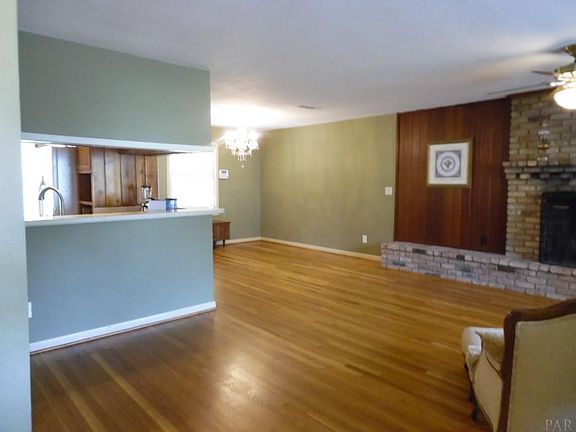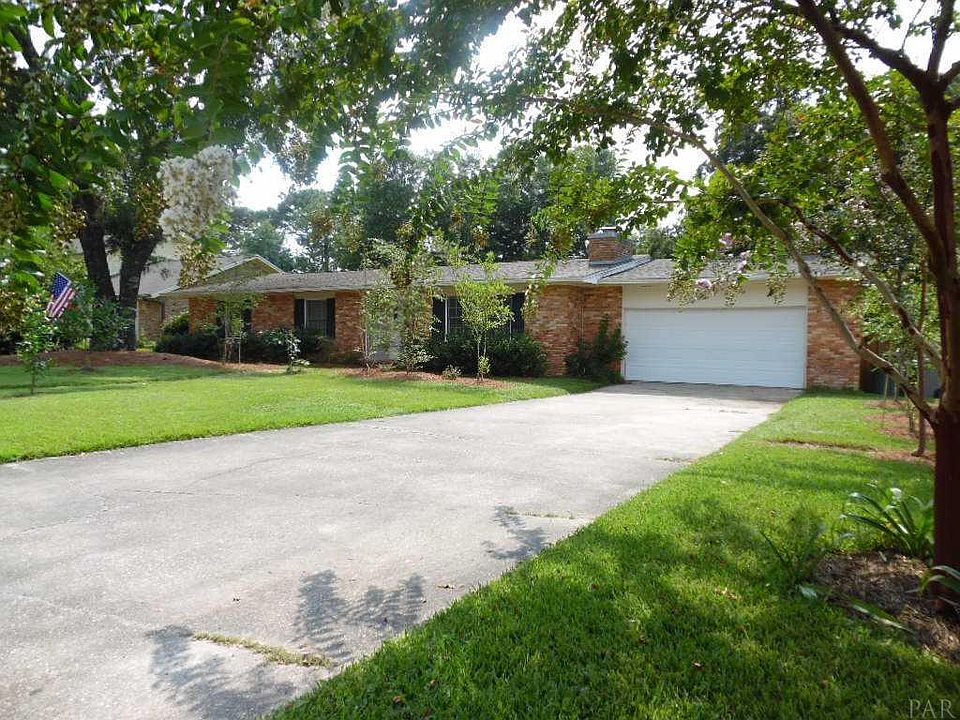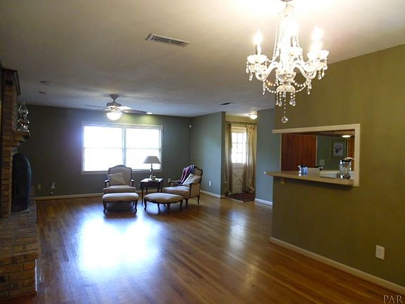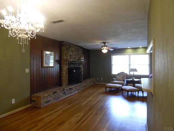 Great home located in Scenic Hills on the golf course. This homes sits with a beautiful view of the golf course overlooking the fairway of hole # 5 and a view all the way up to hole #6. Great view from the great room, kitchen and formal dining room windows of the golf course. Old Chicago brick patio and nice yard with plenty of shade trees. The home sits on .32 of an acre. Great sunset views for an evening of grilling and putting a few holes in the evening right out your back gate. Three bedroom and two bath brick home with 2 car garage. As you walk up the brick sidewalk you enter into the foyer and are greeted with hardwood floors. You have a very large and open living room with wood burning fireplace open to the formal dining room. The kitchen is small but very functional. Solid surface counter-tops have been added with all real wood cabinets with tile flooring. There is a great room that is open to the kitchen for view of the golf course in the evenings. The entire home has hardwood floors. The master bedroom is large with views of the golf course. The master bathroom has a separate shower only. No tub. The hall bathroom has a pedestal sink and tub/shower combination. Tile flooring in both bathrooms. All three additional bedrooms are nice and large. The home as a newer roof with dimensional shingles. The home has been completely rewired with copper wiring. Refrigerator, drapes and rods and chandelier in dining room DO NOT convey with sale of home but the blinds will remain these items will be removed prior to closing. HOA dues are voluntary and 40. per year if you wish to participate. Great home and location. You are minutes to UWF, Baptist Medical towers on Nine Mile Road, Target, Publix, Restaurants, minutes to I-10. Call me today for your tour of this great home. **HOME IS BEING PAINTED ON OUTSIDE TRIM AND SOME WORK DONE INSIDE AT THIS TIME.