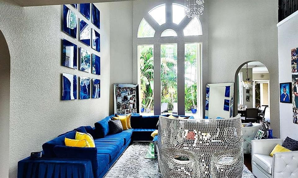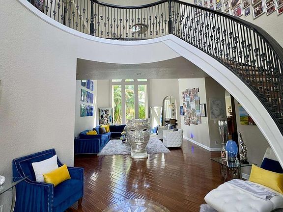 Step into a dramatic great room with 24-foot ceilings and floor-to-ceiling windows that fill the home with natural light and showcase the pool and tropical landscape. The open-concept design connects the kitchen, family room, and outdoor living space, creating seamless flow for entertaining and relaxation.