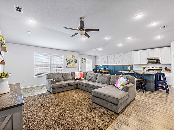 Welcome home to this stylish and move-in ready rental with an open floor plan filled with natural light. You'll love the inviting details, including vaulted ceilings, decorative accent walls, and durable luxury vinyl plank flooring throughout the main living areas. The kitchen is designed for everyday living and entertaining, featuring stainless steel appliances, quartz countertops, a modern porcelain tile backsplash, an oversized island, white cabinetry, and a spacious pantry. Relax in the large backyard or enjoy evenings on the covered patio perfect for unwinding after a long day. Located in a desirable newer community, this home is just minutes from parks, sports facilities, trails, shopping, dining, and top-rated schools. With its combination of comfort, convenience, and style, this lease is an opportunity you don't want to miss.