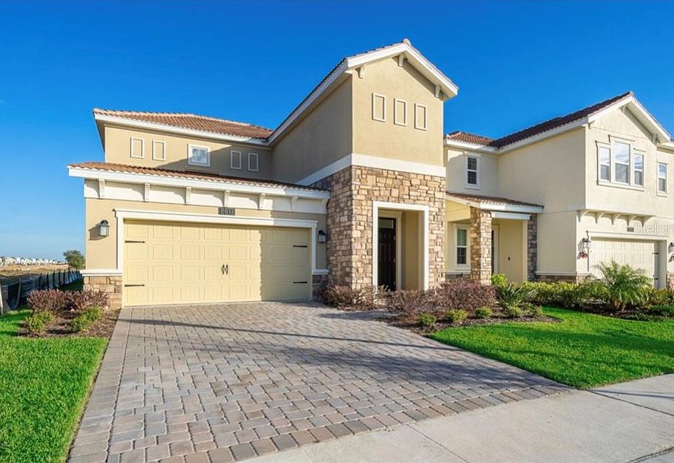 This contemporary & upscale two-story "FULLY FURNISHED" home, located in a gated community, it includes three bedrooms, two and a half bathrooms, and a two-car garage. The upstairs loft area provides families with additional space, and the downstairs level features a spacious master suite. There is also a large family room that leads out onto a covered patio where you can relax and enjoy the water view. This home features a red tile roof, wood cabinetry, quartz countertops in both the kitchen and bathrooms, slate appliances, and an expansive covered lanai to enjoy the gorgeous golf and conservation views, as well as much more! **UPDATE PICTURES COMING SOON!! This home is located at Stoney Brook at Champions Gate. Community features state of the art clubhouse, Fitness Center, Resort-style swimming pool, gated community, and much more. Just minutes away from Walt Disney World, the Omni Hotel and Resort, International Drive, and I-4, where residents and visitors can play, eat, and shop all within minutes from their doorstep.
