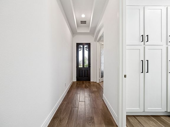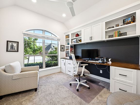 Welcome to 8817 Navidad Falls, a beautifully designed Perry home located in the sought-after master-planned community of Trinity Falls. This thoughtfully crafted residence combines modern elegance, functionality and comfort throughout every space. A private office with French doors provides the perfect setting for work or study, complete with built-in cabinets and desk for added convenience. The gourmet kitchen is a true centerpiece, featuring a spacious island, quartz countertops, stainless steel appliances, gas cooktop, under-cabinet lighting and a large walk-in pantry that ensures plenty of storage and prep space. The open-concept family room is bright and inviting, highlighted by a wall of windows that fill the space with natural light and offer seamless views of the backyard. The primary suite is a relaxing retreat with a spacious bedroom and a luxurious bath that includes a garden tub, separate glass-enclosed shower and a walk-in closet. Secondary bedrooms each feature their own walk-in closets, providing ample storage for family and guests alike. Additional highlights include Jellyfish lighting, a mud room located off the two-car garage, a utility room with built-in cabinets and covered patio with retractable screens - perfect for relaxing or entertaining year-round. Living in Trinity Falls means enjoying an exceptional lifestyle surrounded by nature and top-tier amenities. Residents have access to The Club, featuring a beach-entry pool, splash pad, pavilion with fireplace and grills, multiple play areas and parks. The Lodge offers a resort-style pool, fitness center, event lawn and coworking spaces. Miles of scenic trails, tranquil lakes and sprawling 350-acre natural park create the perfect setting for outdoor recreation and community connection. Ideally situated just minutes from shopping, dining and entertainment along the Highway 380 corridor, this home perfectly blends luxury, convenience and community in one of McKinney’s most desirable neighborhoods.