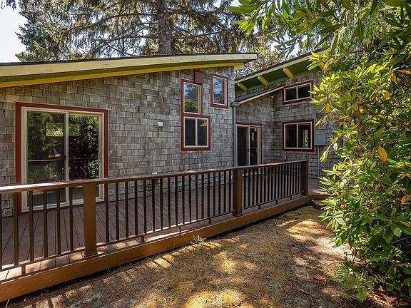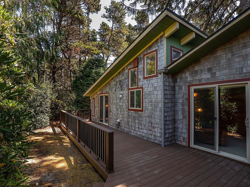 Charming and cozy beach retreat in the desirable Heceta Beach area—just two blocks from the sand! This home isn't like the others—you'll feel it the moment you walk in. Cedar shake siding, gutters, a spacious low-maintenance deck with covered entry, and a rare detached garage with storage, room for workshop, and windows. Lot features room for RV/boat parking plus extra driveway space. Two tax lots total .19 acres on a wooded, level lot with cedar, fir, rhododendrons, and native plants offering privacy. Inside feels like a true cabin getaway with vaulted ceilings, cedar paneling, and solid wood beam accents. Living area & primary bedroom open to the deck. Loft/bedroom adds extra sq ft. Full bath features a vintage tub/shower and high ceilings with windows to keep it bright. Detached bunkhouse/studio with a half bath for added versatility. New roof on main area of home & bunkhouse/studio. Peaceful full-time living or great investment just steps from the ocean!