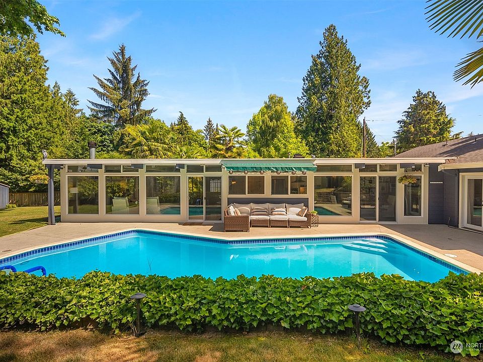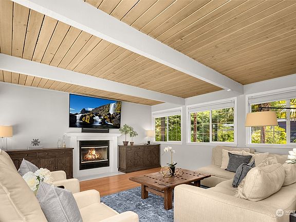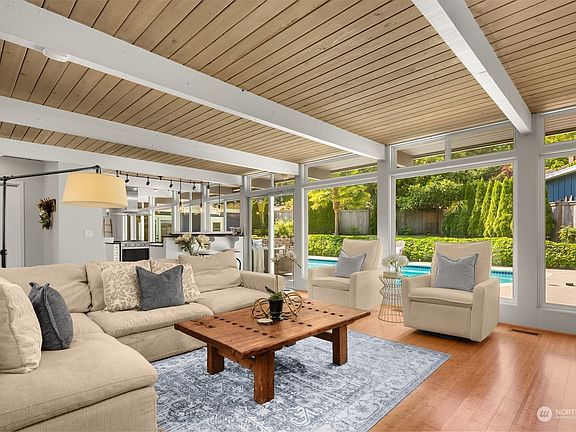 Mercer Island home offering the signature elements most loved in mid-century modern architecture. The home’s core showcases an open kitchen, dining room & living room that flow naturally into each other offering unfettered views through floor to ceiling windows of the property’s pool & gardens. Clean lines, whitewashed beamed ceilings & multiple sliding glass doors highlight a classic open plan where the interior & exterior seamlessly knit together. Updated kitchen & baths, primary suite with vaulted ceilings, spa bath & 3 California Closets. Live the beach life with central A/C, palm trees & pool for the summer. Fenced yard & neighborhood walking trails to enjoy all year. Fully finished 3-car garage with gym space & extra roll-up door.