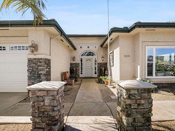 Welcome to Black Horse Estates, a highly coveted neighborhood in Santee thanks to it's unique characteristics and fantastic location. Featuring only single story homes with soaring ceilings and sizeable lots, owning in Black Horse Estates can provide a feeling of exclusivity, a feeling that only grows once you observe the pride of ownership reflected throughout the neighborhood. Set in a secluded double cul-de-sac layout with easy access to several freeways, residents of this charming community find it easy to reach downtown, our beautiful San Diego beaches, or our quaint mountain towns with a short drive. At 8819 Diamondback Drive, you're greeted by an impressive chandelier hanging from the twelve foot high ceiling of a welcoming foyer, which is only steps away from the relaxing sunset views found in the living room. With modern trends seeming to move away from formal sitting areas, the living room is often repurposed for games or theatre fun, leaving most of life's day-to-day moments to the impressive great room. With 10' ceilings throughout the remainder of this home, you're not likely to feel cramped as you enjoy your peaceful spaces. Stainless Steel appliances with gas cooking, and granite countertops with island bar seating, blend seamlessly into the dining and seating areas of the great room as you create new memories year in, year out. With water efficient landscaping in the front and rear, making maintenance a cinch, and two high quality synthetic Palapa's in the back yard, you won't have to waste endless hours of your precious free time taking care of the yard. On day one of owning this home, you can sit down in your tropical backyard oasis and soak up the soothing sounds of the waterfall, as you take in vibrant sunset hues from the westerly mountain view. For the garage lovers out there, this home is perfect with ample cabinets and workbenches, stained concrete floors, and a climate controlled environment thanks to the houses dual unit HVAC system being extended to the 3-car garage. Finally, if covered RV parking was on your Bingo card, you better hurry B4 it's gone... as the approximately 35x13x11 metal parking structure is sure to complete someone's Bingo. Able to accommodate an approximate 10' additional length uncovered, this feature should serve your needs well. Other notable features include: owned solar, walk-in pantry, walk-in closet, dedicated laundry room with a utility sink, metal screen doors, ceiling fans, upgraded dual pane vinyl windows, an insulated custom built shed, rain collection barrels, and more! Come see this beauty before it's gone...
