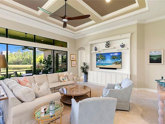 Sleek off-white cabinetryScreened lanaiTranquil lake viewsHigh ceilingsCustom-built media wallOpen airy floor planLush preserve