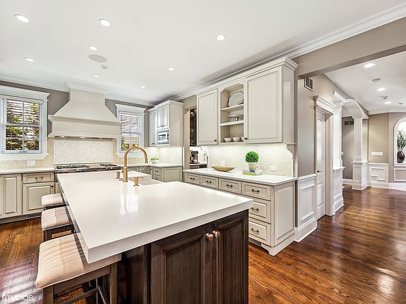 Rare opportunity to find this updated newer construction brick classic in the heart of town on a deep (187') lot! Walk-to-everything: restaurants, shops, parks/playgrounds, K-8 schools and train are all steps away from this fresh, bright and stylized spacious 4+1 bedroom/5.2 bathroom home with extensive 2022 updates throughout! Built to the highest standard, the open floor plan, hardwood floors, stunning custom mill work, lofty ceilings and wide hallways make this a must-see! Dramatic double height foyer with wainscoting and sweeping staircase. Lovely living room boasts a handsome gas fireplace, floor to ceiling windows with french doors to the separate formal dining room with gorgeous curved bow windows and stylish butlers pantry and wet bar connecting it to the updated and bright kitchen. 2022 remodeled kitchen offers large gleaming quartz island with seating, high-end appliances including 2 dishwashers, and a fabulous adjacent breakfast area. Kitchen opens to a fantastic family room streaming with light featuring a gorgeous masonry fireplace and french door to the patio with fabulous views of the private fenced gardens. A perfect mudroom with bench and cubbies entered from the rear with a mudroom powder room as well as a formal powder room off the main hallway and a stunning first floor private office with custom built-ins and double french doors. Upstairs, a wide hallway leads to a large, tranquil primary suite with welcoming fireplace, spacious dual walk-in-closets and large bathroom with radiant heat floors, jetted Neptune tub and separate walk-in shower. Three good sized bedrooms all with spacious closets and en-suite bathrooms with heated floors plus a bright updated 2nd floor laundry with pull-down stairs to access attic storage. The huge lower level offers all kinds of fun with high ceilings, a large recreation area with a fireplace, a wet bar with a beverage center, plus a spacious bonus 5th bedroom with full bathroom and ample storage. The professionally landscaped deep lot offers a fabulous sun filled south facing fully fenced backyard with plenty of space for summer outdoor living day or night as it includes wonderful moonlighting as well as a brick two-car garage with custom wood door and 2 car parking pad/turning space. An absolute must-see in the heart of town in desirable Crow Island location. First showings start Friday July 21st.
