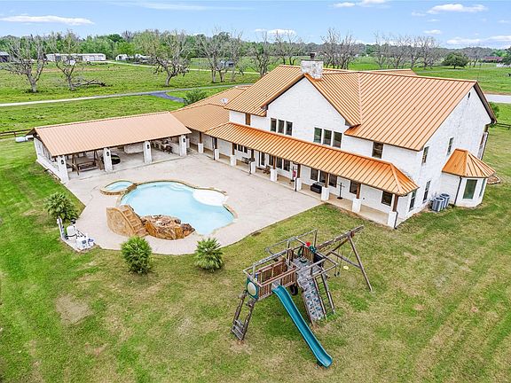 DISCOVER YOUR OWN INCREDIBLE PIECE OF TEXAS! THIS 34 AC. Ranchettes is - MINUTES FROM GULF COAST FISHING & 45MIN DRIVE TO HOUSTON! Custom Home designed for family & friends - Features: Hand Scraped Tennessee Hickory Floors; Awesome Cathedral Ceiling w/ Handmade Trusses; Magnificent Hand-Hewn Cedar Staircase, Antler Chandelier, 30’ Stone Fireplace, Expansive living room host 2 sitting areas, wet bar, Primary Bedroom , enormous closet with island, ensuite has walk-thru shower & jetted tub & guest bedroom w full bath on 1st Floor; Custom High-End Kitchen Open to living & dining Area; Office; UPSTAIRS: 3 Bedrooms 1 with Built-In desk, 2 Full Baths, Theater Room, Balcony; Gorgeous Heated Pool w/ Grotto, Slide, Waterfall, & Spa; Huge Pavilion w/ Outdoor Kitchen & 2 Baths; 8 Car Garage w/ Air Conditioned Flex Room; Lighted arena, horse barn large metal shop with kitchen & bath. OR add more land and improvements details are covered in document attachment Possible Event Venue!