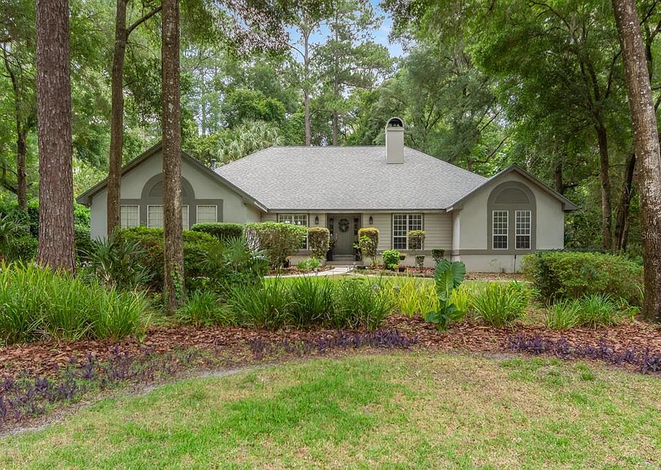 Move right in to this beautiful 4 bedroom 2.5 bath pool home offering eye-catching curb appeal and great design. The home's mature landscaping and high elevation make it stand out in this desirable Haile Plantation neighborhood. The inviting foyer leads you past the formal dining room on the left and large living room with a stunning fireplace on the right. The magnificent great room is the heart of the home and has a large entertainment area, vaulted ceilings and a floor to ceiling double-sided stone fireplace with built-ins on both sides. The kitchen has a center island, granite countertops, wood cabinets, stainless steel appliances, 2 pantries and opens both to the great room and the adjoining breakfast/morning room that looks out over the pool. The spacious primary bedroom suite includes two walk-in closets and a beautifully tiled master bath with separate vanities, a jetted tub and a walk-in shower. The secondary wing has three large bedrooms, one full bath and one half bath. The home is beautifully finished with gorgeous wood floors in the dining room, living room, great room, and all of the bedrooms, tile and crown molding. The screened pool with a tranquil rock waterfall is a great place for gathering and overlooks the very private, fenced over half an acre lot with mature landscaping. The Haile Plantation community offers walking/running trails, parks, playgrounds, the Haile Village Center with a farmers market on Saturday mornings and the Hawkstone Country Club (membership required) that features a signature Gary Player golf course with a driving range and putting green, tennis courts, pickleball courts, 2 pools, a gym and upscale dining.