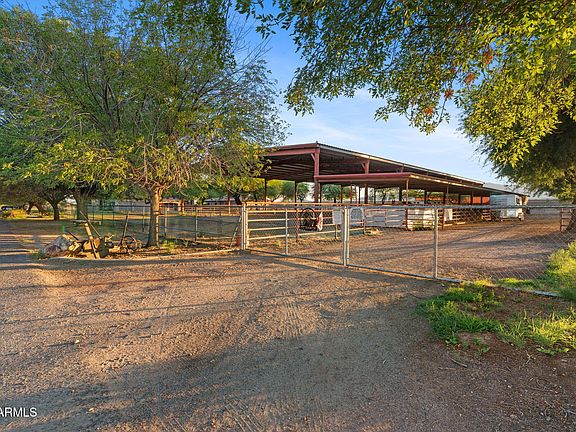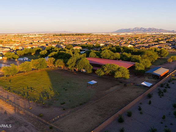 Exceptional 4+ Acre Horse Ranch in Waddell — An Equestrian Dream. Beautiful 3-bedroom main home with granite counters, knotty alder cabinetry, and Cantera stone fireplaces combines rustic charm with modern comfort. A separate guest house with private parking is ideal for multi-gen living, guests, or rental income. Premium horse amenities include a massive, covered riding arena for year-round training, spacious hay barn, tack room, multiple stalls and an irrigated pasture. Mature lush landscaping, mountain views, and ample space for RVs, trailers, and equipment complete the setting. Includes a separately deeded parcel perfect for building a second home, additional turnout, or future resale. No HOA — a rare opportunity to own a fully equipped horse property. This property offers even more potential as it consists of two separate tax ID parcels with the possibility of being split into three parcels (buyer to verify). That means you could build up to three separate homes, operate a working hobby farm, board horses and rent out stalls, or lease the guest casita for income. Situated on a shared well, this estate provides flexibility for personal enjoyment, small business use, or even as a project for builders and developers seeking multiple lots. Located in Waddell, a fast-growing yet still rural-feeling community at the base of the White Tank Mountains, you'll enjoy wide open spaces, starry nights, and equestrian-friendly living while still being only minutes from shopping, dining, Loop 303, and the conveniences of the West Valley. Properties like this are increasingly rare you could not construct it today for the list price, making it a truly incredible opportunity.