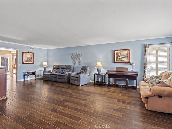 Truly a one-of-a-kind home of this size to be a single-level with tremendous curb appeal! Step inside with an inviting presence to a bright and open living room featuring tile floors, a beautiful stone-framed fireplace, and an elegant electric fireplace cabinet that adds warmth and charm. A wide archway leads you into the expansive kitchen, complete with granite countertops, a large peninsula with bar stool seating, abundant cabinet space, and an adjacent dining area with direct patio access—perfect for indoor-outdoor entertaining. A standout feature of this home is the enormous family/bonus room, showcasing a stylish full bar with seating for 7 bar stools, pool table setup, brick-framed fireplace, and custom built-in shelving. Located on both ends of the family/bonus room are two separate office spaces - offering flexibility for work-from-home, creative studios, or hobby spaces. An ideal layout with all bedrooms located on the left side of the home including the primary bedroom/bathroom. Other special features include central AC and heating, crown molding throughout, and direct-access 2 car garage. Enjoy the thoughtfully designed outdoor areas including a cozy patio just off the kitchen, a gazebo-covered back patio, and custom-installed turf in the backyard and side yard for low-maintenance greenery year-round - wonderful space for entertaining and enjoying time with family. An amazing location with close proximity to shops, restaurants, schools and freeways for commuters. This home truly combines comfort, function, and style in one incredible package. Don’t miss the opportunity to own this one-of-a-kind property!
