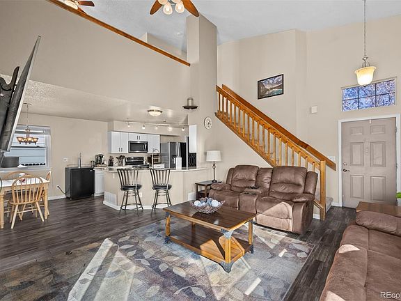 Charming and well cared for home with a PRIMARY SUITE ON MAIN LEVEL! Only two stairs to enter the home! Vaulted living room with an open and inviting floor plan. Remodeled kitchen and baths. The kitchen features newer stainless appliances, granite counters with a breakfast bar, plenty of counter space, cabinets and a pantry. The new wood grain porcelain tile floors throughout the great room, kitchen and dining area are gorgeous. This home is light and bright and features a delightful bank of south facing windows. The primary suite and primary bathroom are both vaulted. The updated primary bathroom features a soaking tub, designer tile and a spacious counter with two sinks. The primary bedroom has more than enough space for a king size bed. Special features include gas fireplace, central AC, newer windows and six-panel doors throughout. The second-floor loft looks out over the great room -- a perfect sitting area, play area or office. The remodeled second floor bath features designer accents and tile. Both second floor bedrooms are a good size. A newer and quality sliding glass door opens to an inviting and sunny patio. The full basement features a bathroom rough-in, several egress windows that bring in lots of light and tons of extra space to finish in the future. NO HOA! Especially convenient location for getting around town -- just north of E-470 and just east of Jordan Road. Only minutes to popular Downtown Parker. Grocery stores, shops and restaurants are only minutes away. Only a few blocks to Cottonwood Park!
