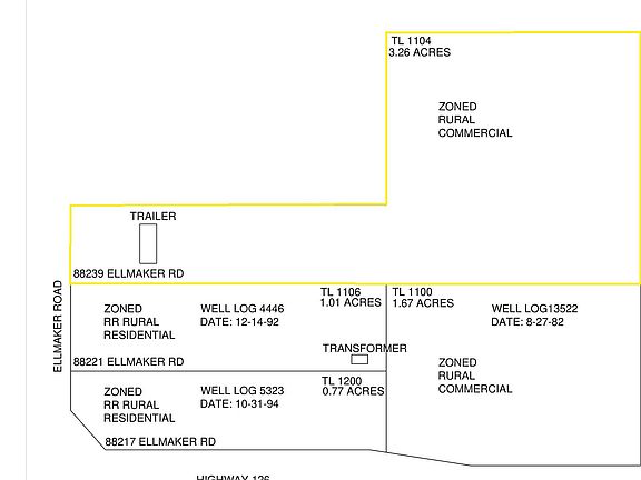 3.26 acres of Rural Commercial land in West Lane County. Just outside the Veneta UGB.This Rural Commercial lot has well, septic and power in and can be purchased separately or with the following tax lots: TL 01200-.77 acres zoned Rural Residential w/Hwy 126 frontage RMLS #21192558.TL 01100-1.67 acres zoned Rural Commercial w/ Hwy 126 frontage RMLS 21404448.TL 01106-1.01 acres zones Rural Residential RMLS 21667652. Manufactured home is not included.