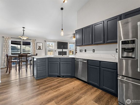 Move in Ready in the Madrona Park neighborhood. This spacious home offers a prime location just a few min to JBLM Mounts Rd gate w/ easy access to I-5, shopping, schools, & restaurants. As you enter, soaring ceilings greet you! The living area features a gas fireplace & flows into the large kitchen, which boasts quartz countertops and ample storage, perfect for cooking & entertaining. The main level includes the Primary suite & a dedicated formal dining room or flex use as a den/play area or office. Upstairs, you will find 2 large bedrooms & a loft area. Enjoy a fully fenced backyard with fruit trees and a patio for outdoor entertaining, and convenient side gate entry. Roof is replaced in 2023! This home is priced well!